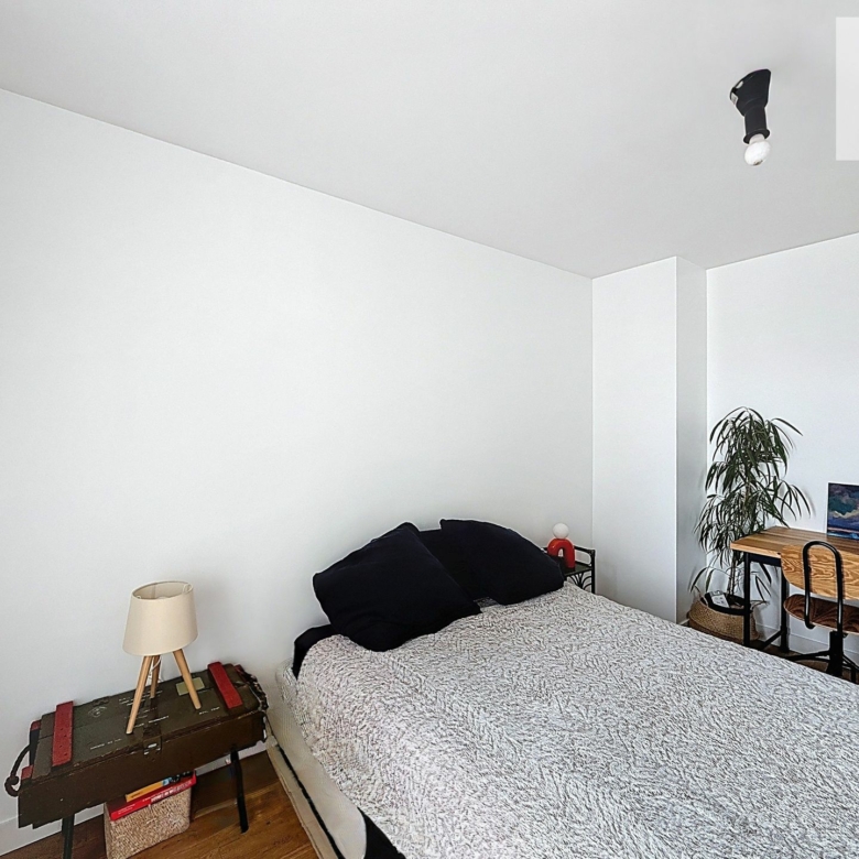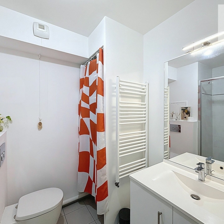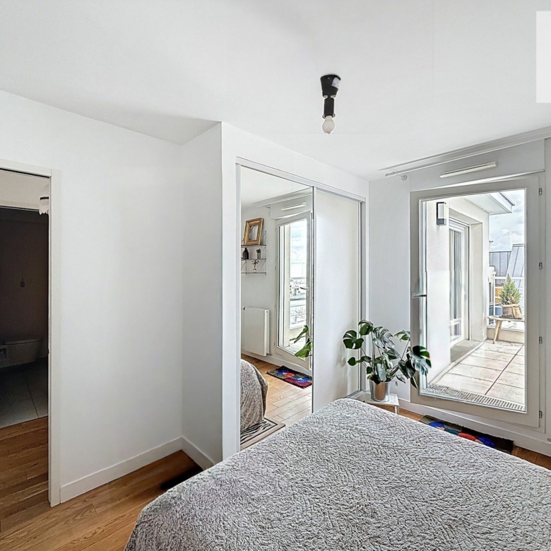 L’espace nuit se compose d’une belle chambre de 12 m² aux volumes généreux, disposant de grands placards de rangement. Véritable atout de l’appartement, la chambre donne un accès direct à une grande terrasse privative, offrant une vue dégagée et un espace extérieur privilégié. Une salle d’eau contemporaine avec douche à l’italienne, meuble vasque, WC et lave-linge complète ce bien parfaitement agencé.